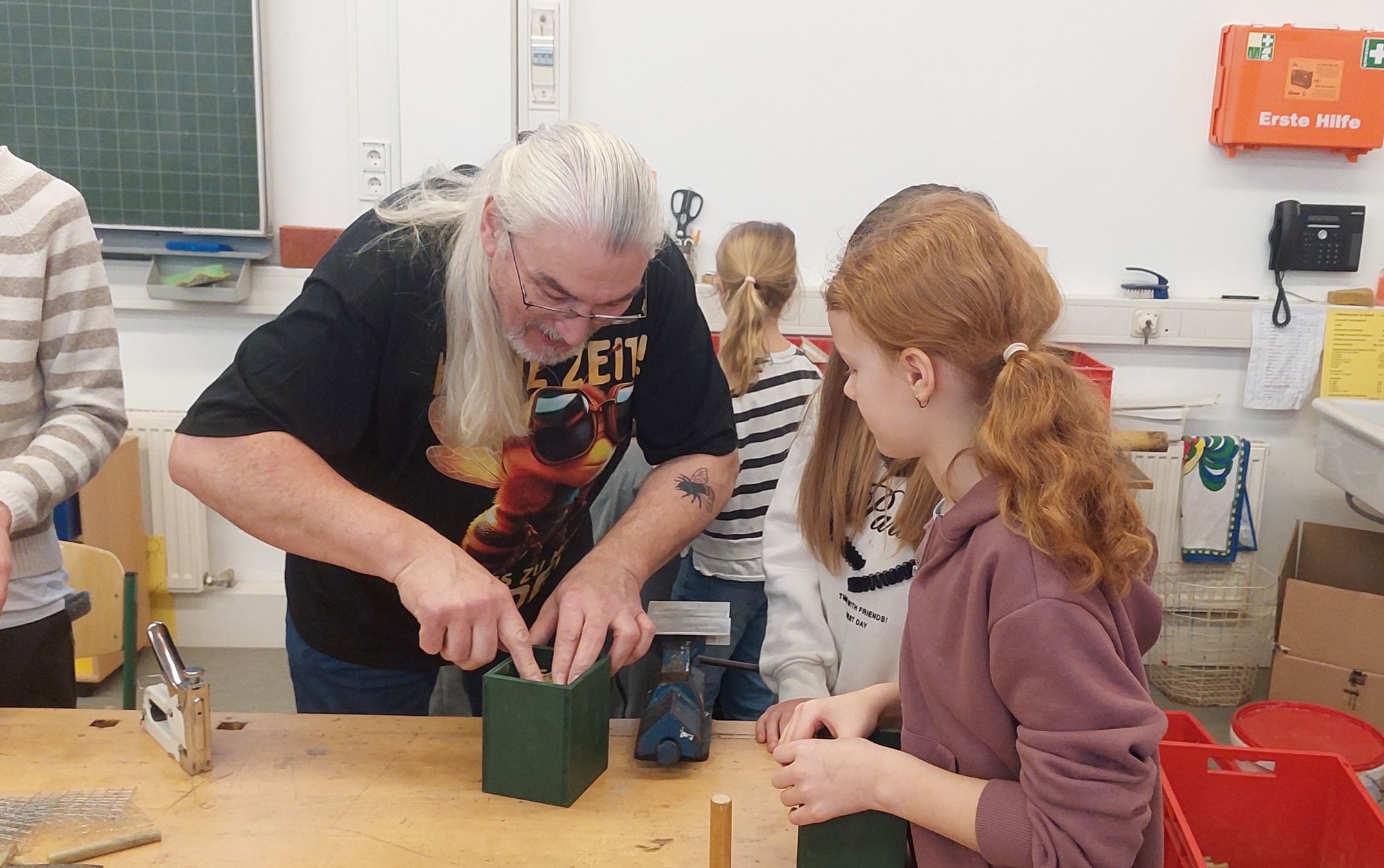 Die Kinder sind emsig am Basteln, wenn’s kniffelig wird unterstützen neben „Wildbienen-Didi“ auch die Klassenlehreinnen Frau Väth und Frau Dillmann. Zu Besuch im Unterricht kamen neben Rektorin Andrea Wilm, Christina Bachmann von der „Summt-Initiative“, Gerald Zahn vom Vereinsring Pflaumheim sowie Burkhard Zahn als Vertreter der Interessensgemeinschaft „Blühender Bachgau“. Nach getaner Arbeit dürfen die Kinder ihre kleinen Kunstwerke stolz mit nach Hause nehmen. Sie sollen im Lebensbereich der Kinder aufgestellt werden – im eigenen Garten oder im Garten der Großeltern, auf dem Balkon oder auf der Terrasse etc. Damit alles gut funktioniert gibt es noch Informationen darüber, wo und wie man die Nistmöglichkeit für Wildbienen in der heimischen Umgebung platziert und welche Pflanzen die Wildbienen in der Nähe des Hotels benötigen, um dort einzuziehen.