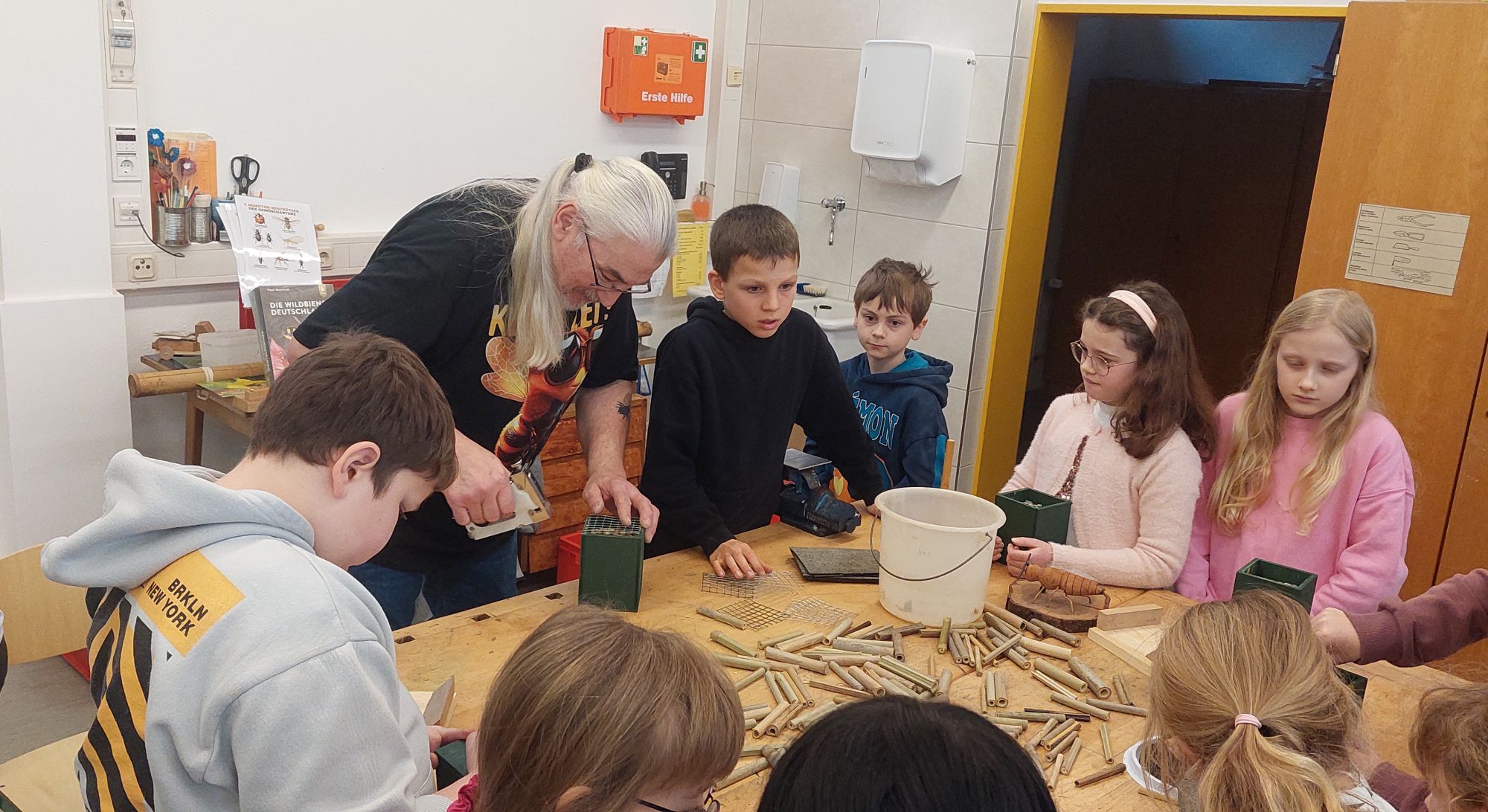 48 Kinder der Klassenstufen 2 und 4 bauten gemeinsam mit „Wildbienen-Didi“ insgesamt 50 Wildbienenhäuser – unterstützt von der Landkreis-summt-Initiative, dem Vereinsring Pflaumheim sowie dem Plaumheimer Naturschutzverein.